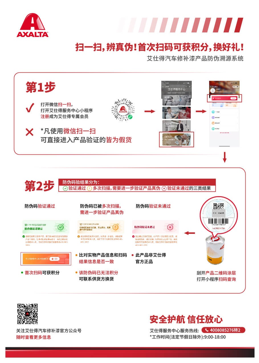 因市场存在仿冒伪劣产品,我们已停用微信扫一扫来鉴别产品真伪。请使用官方指定艾仕得服务中心小程序来鉴别产品真伪。